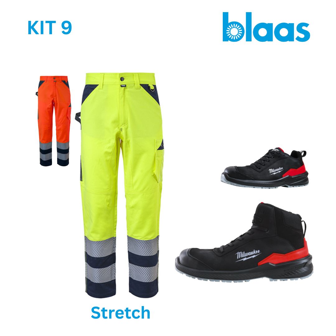 Pantaloni ad alta visibilità bicolore, vita elastica, chiusura con zip e bottone, multiple tasche funzionali con zip/velcro, bande riflettenti al fondo gamba, tessuto twill robusto, vestibilità regolare.